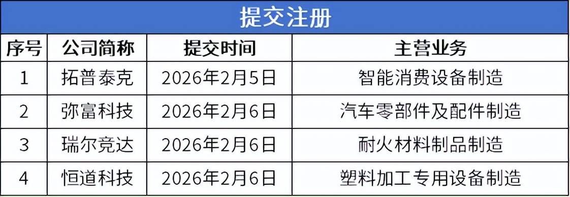 超牌新材通知布告显示,2026年1月,公司向监局报送了存案申请材料,2月5日证监局受理了公司提交的上市存案申请,公司进入期,机构为开源证券。