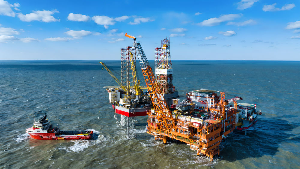 这是2025年2月8日拍摄的渤中26-6油田一期开辟项目海上功课平台(无人机照片)。发(杜鹏辉 摄)。