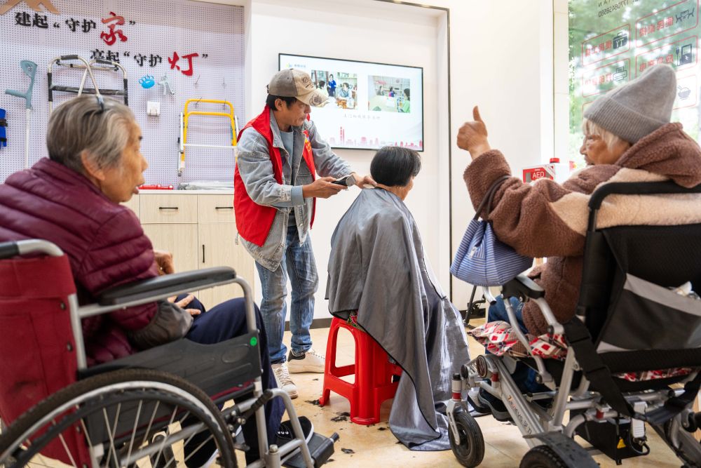 2025年11月6日,正在湖南省长沙市望城区高塘岭街道湘陵社区,意愿者为老年人和残疾人士免费剃头。记者 陈思汗 摄。